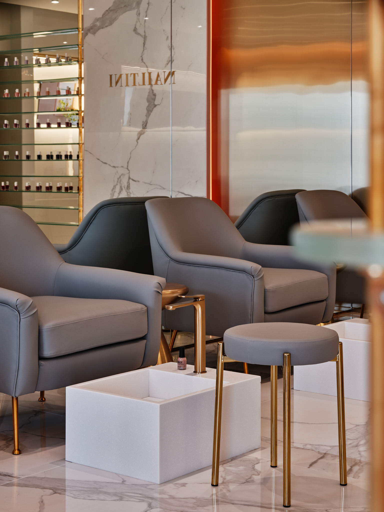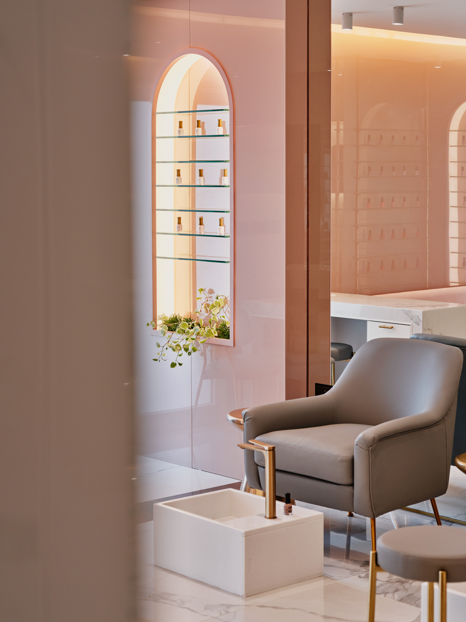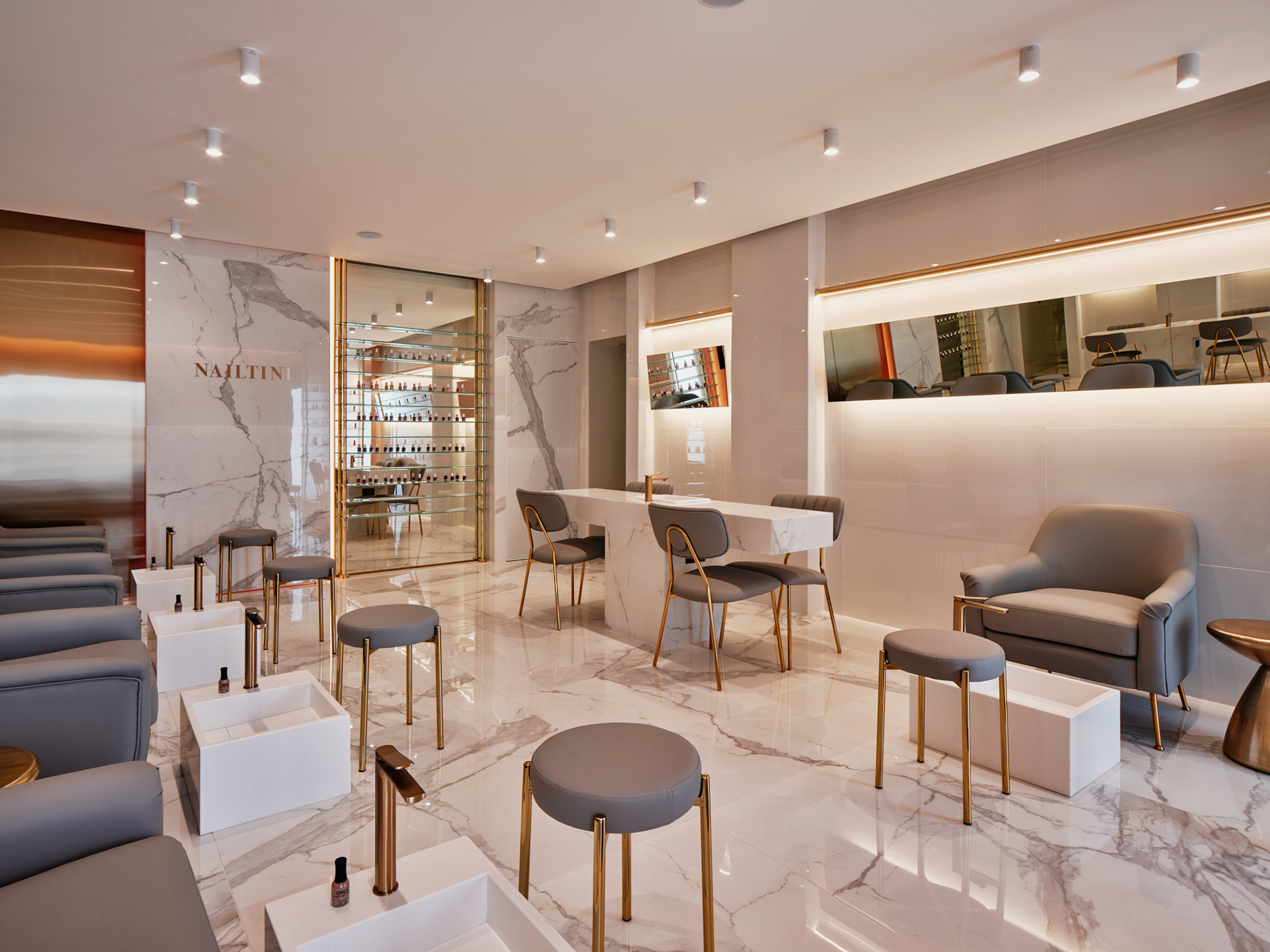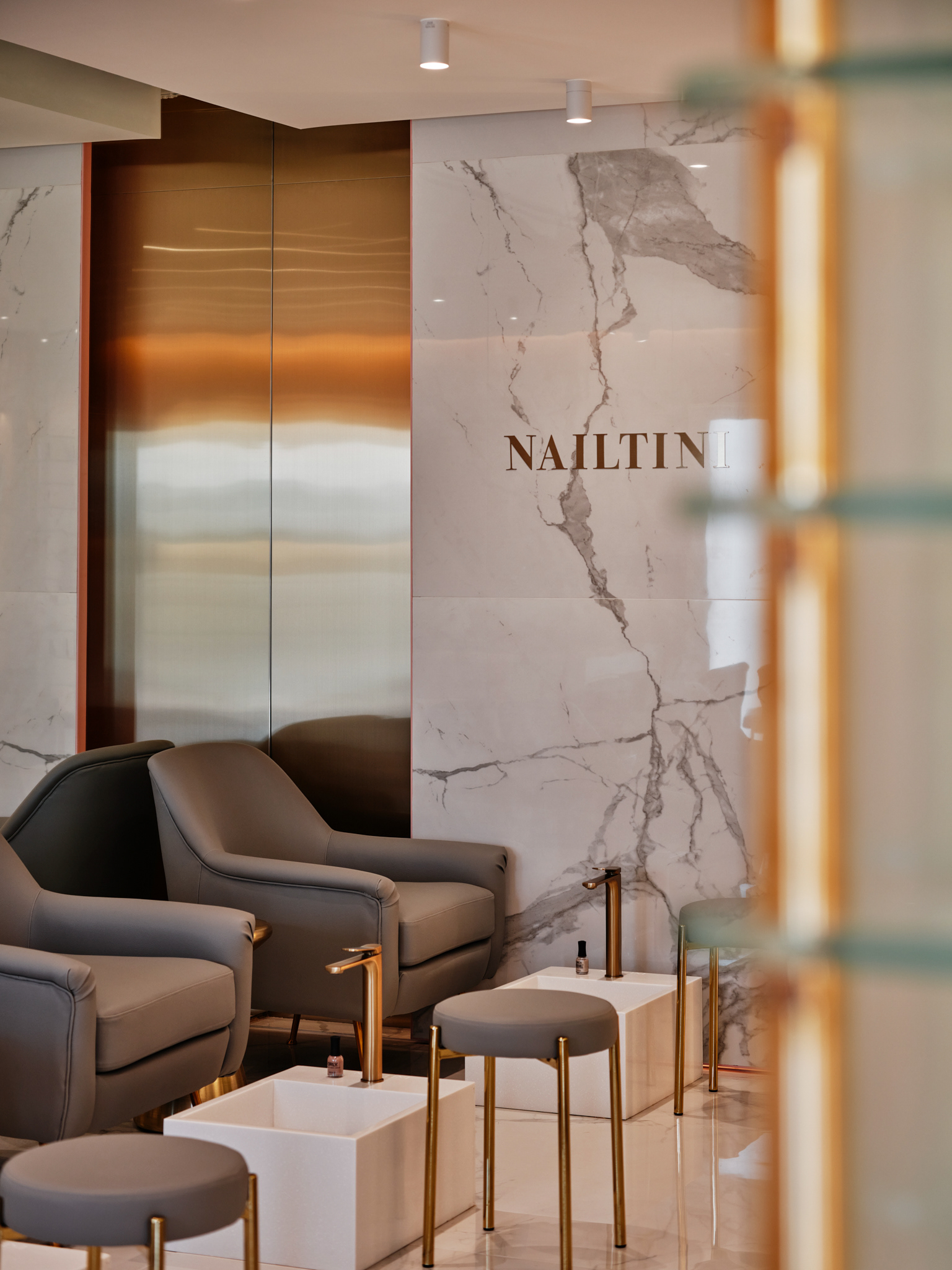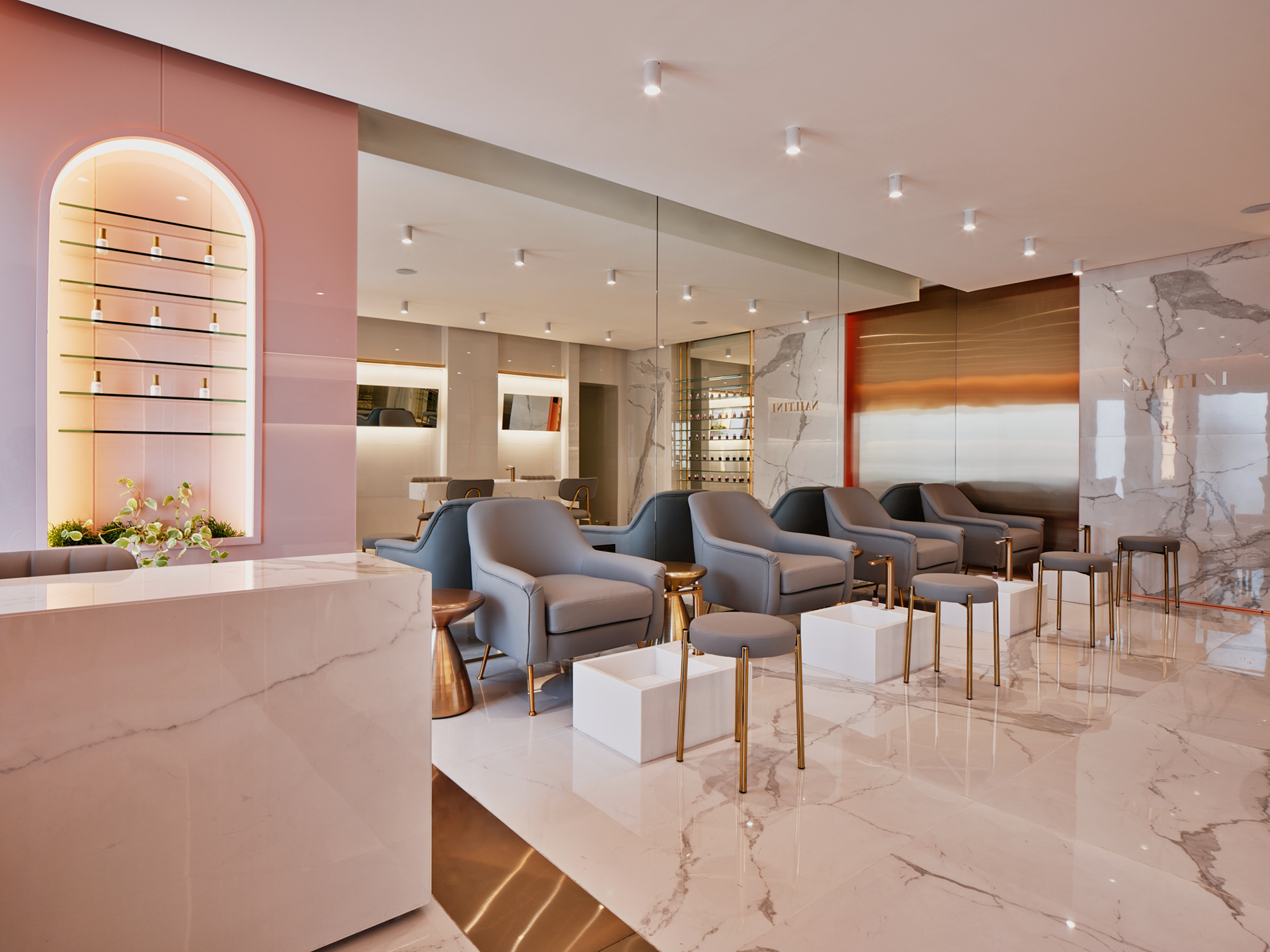 Nailtini - interior design by STUDIO FORM - a complete redesign of the brand’s first branch in Al Surra, introducing a new brand aesthetic & use of space. Photography by Mohammad Taqi
